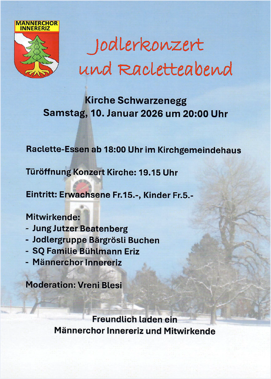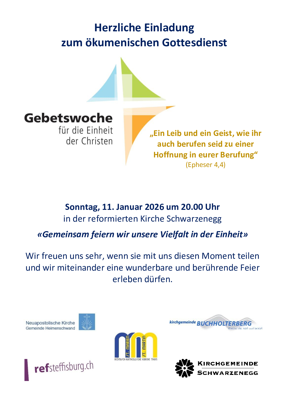 Auf dem neusten Stand Veranstaltungen Grüsse zum Advent Jodlerkonzert und Racletteabend Ökumenischer Gottesdienst Kirchensonntag 2026 Chindernami 2026, 1. Jahreshälfte Jodlerquartett Männertreu Agenda der Kirchgemeinde Diese Woche Gottesdienste und Veranstaltungen ansehen Auf dem neusten Stand Chiucheposcht aus unserer Kirchgemeinde Aktuelles OeME-KommissionOeME-KommissionOeME-KommissionOeME- Kommission Im Rahmen ihrer Möglichkeiten engagiert sich die Kirchgemeinde... mehr NeubeginnNeubeginnLiebe Gemeinde, Junge und Alte, liebe alle zusammen! Ich begrüsse Euch alle ganz herzlich in... mehr Adieu – à DieuAdieu – à DieuLiebi Froue u Manne, Meitschi u Buebe vo dr Chiuchgmein Schwarzenegg Itz isch es auso Zyt, zum... mehr KG-Infos März 25KG-Infos März 25Kurz vor dem Einzug in das Pfarrhaus von Pfarrer Balázs Kalincsák per Ende Februar, sind mit... mehr