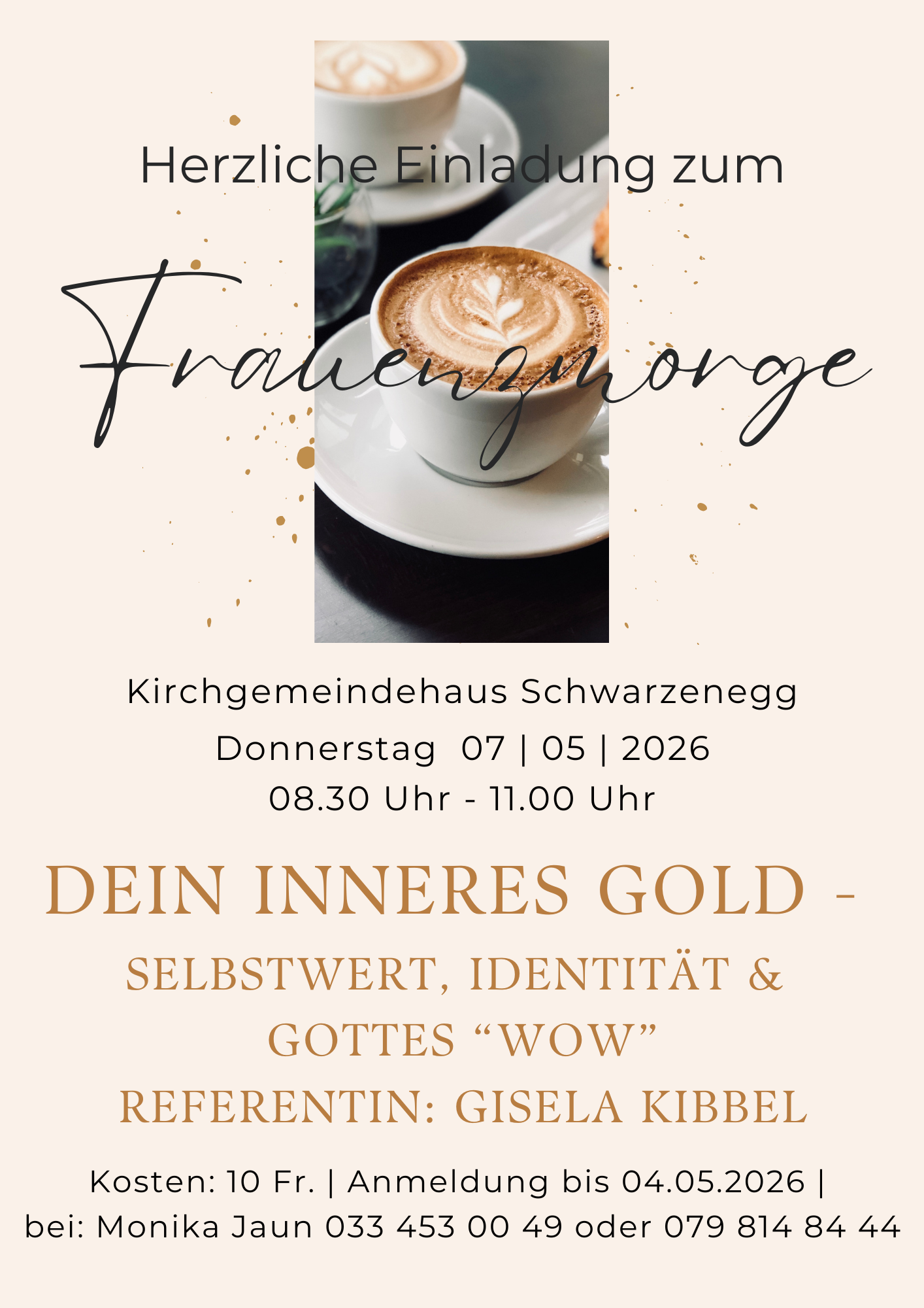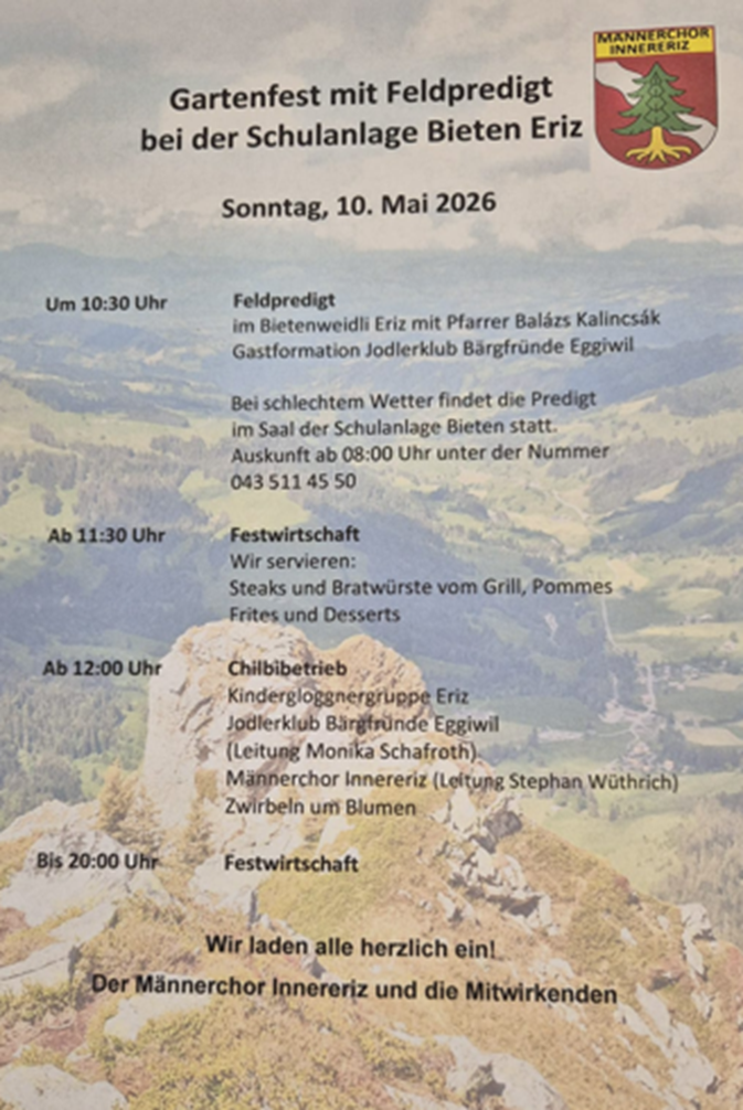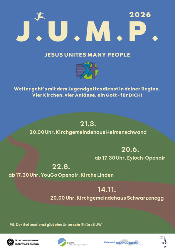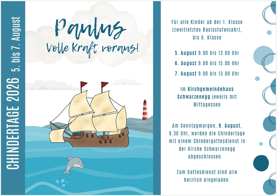 Auf dem neusten Stand Veranstaltungen Chindernami 2026, 1. Jahreshälfte Jugendtreff 2026, 1. Jahreshälfte Frauenzmorge 2026 Gartenfest 2026 Chindertage 2026 J.U.M.P 2026 Agenda der Kirchgemeinde Diese Woche Gottesdienste und Veranstaltungen ansehen Auf dem neusten Stand Chiucheposcht aus unserer Kirchgemeinde Aktuelles OeME-KommissionOeME-KommissionOeME-KommissionOeME- Kommission Im Rahmen ihrer Möglichkeiten engagiert sich die Kirchgemeinde... mehr NeubeginnNeubeginnLiebe Gemeinde, Junge und Alte, liebe alle zusammen! Ich begrüsse Euch alle ganz herzlich in... mehr Adieu – à DieuAdieu – à DieuLiebi Froue u Manne, Meitschi u Buebe vo dr Chiuchgmein Schwarzenegg Itz isch es auso Zyt, zum... mehr KG-Infos März 25KG-Infos März 25Kurz vor dem Einzug in das Pfarrhaus von Pfarrer Balázs Kalincsák per Ende Februar, sind mit... mehr